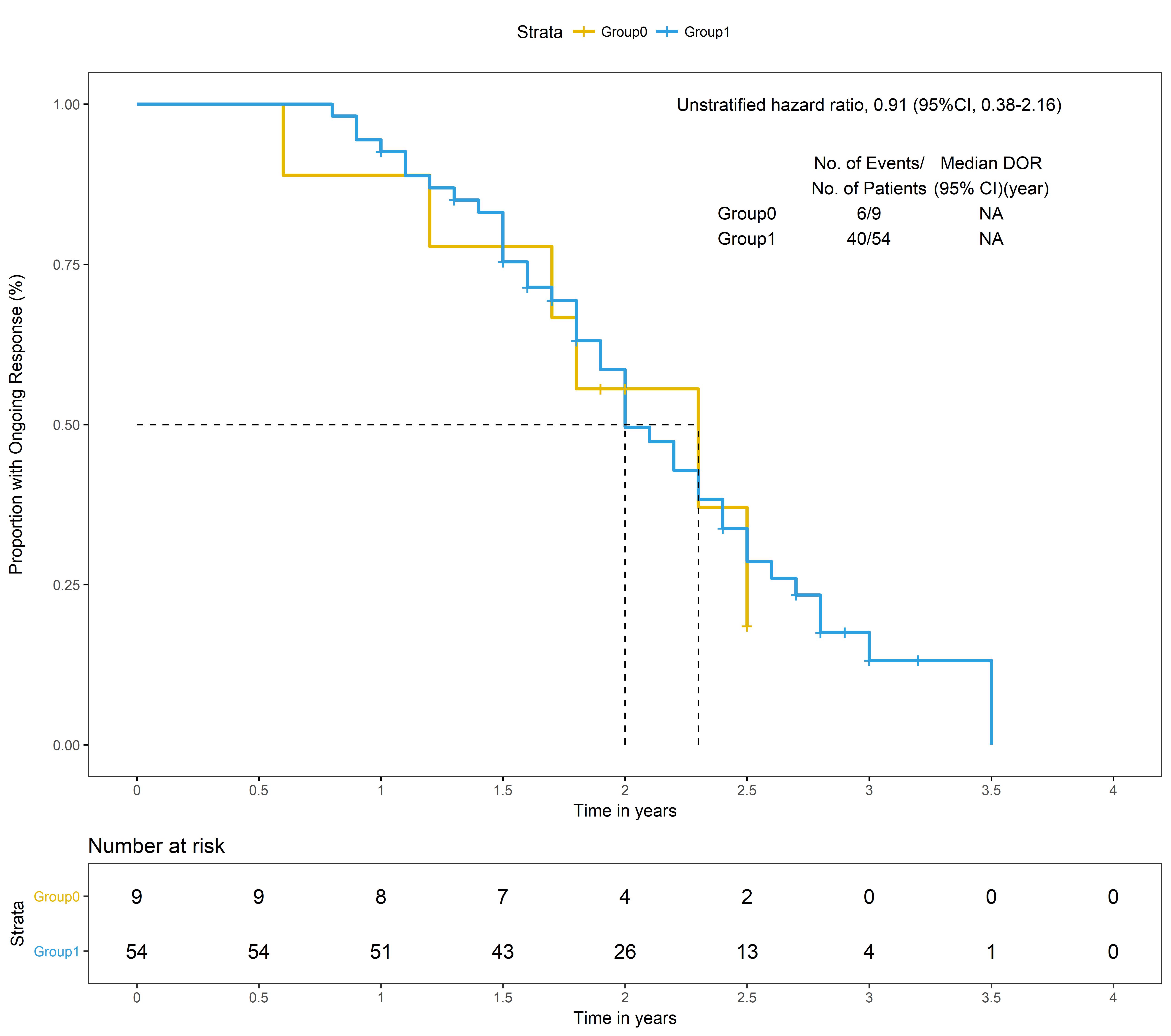text2<-paste(paste("Median DOR", "(95% CI)(year)",sep = "\n"),table2["DOR",1],table2["DOR",2],sep = "\n")