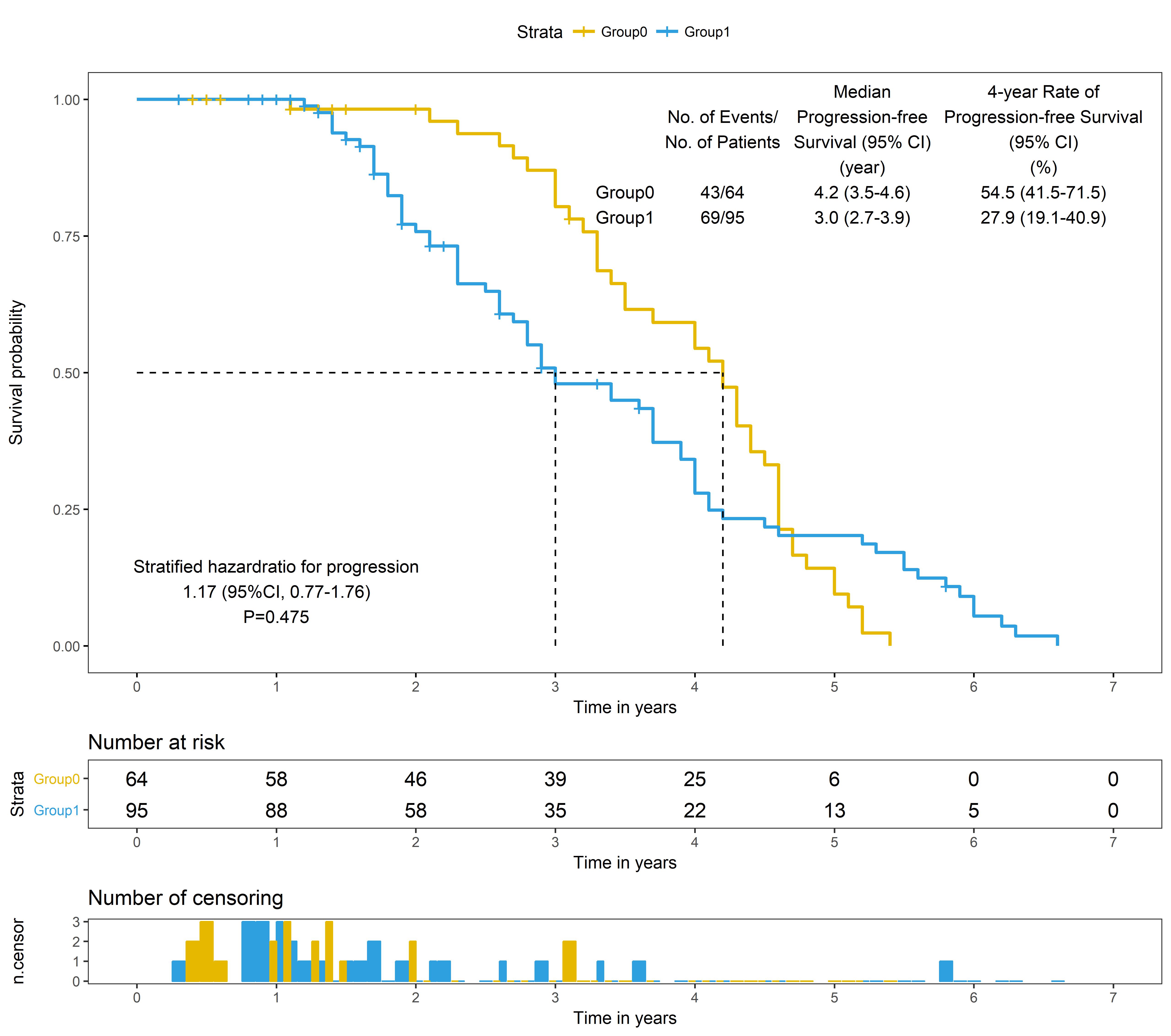fit <- survfit(Surv(pfsyear, pfscensor) ~ group, data = dt)